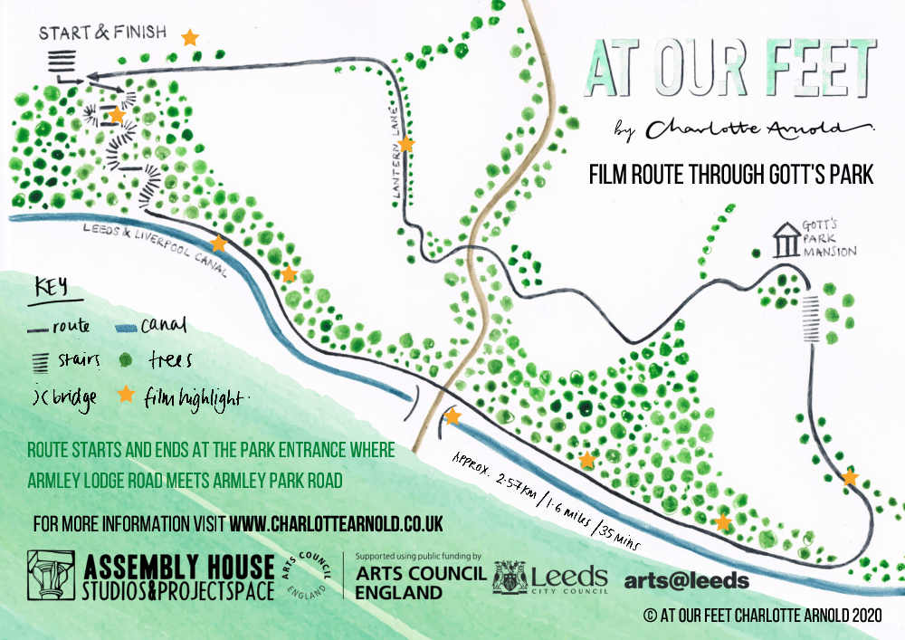 AT OUR FEET is a meandering journey through Gott’s Park, that navigates through woodland, parkland, water and movement. It is a dance film to celebrate and magnify the natural movement of Armley Park and Gott’s Park. This celebration of nature is echoed by the harmonising of a human body which curls, and slots, and folds itself into spaces, but also tramples, and runs and swings all over it.